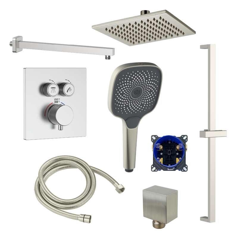 Kit includes: (1) 12-in showerhead, (1) 16-in shower arm, (1) two function thermostatic valve and trim, (1) Forever Box, (1) 5-in hand shower, (1) 36-in sliding bar, (1) 59-in shower hose, and (1) wall elbow