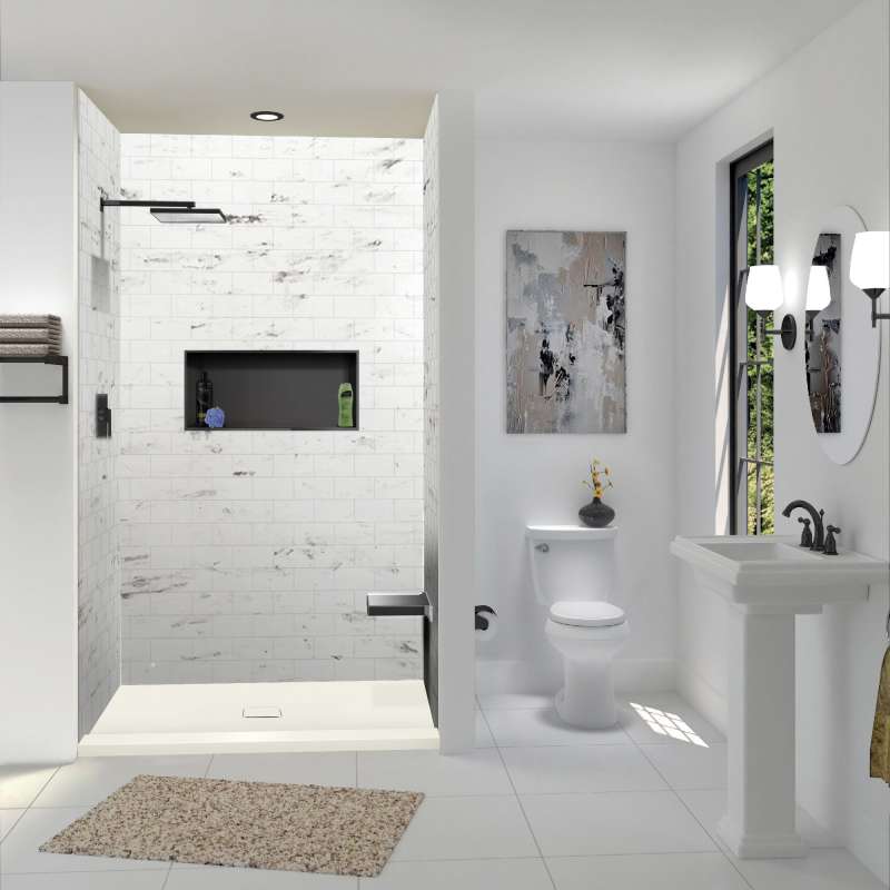 • DRAIN: center drain location with SMC color-matched drain cover that conceals a conventional 2-in shower drain, creating a pleasing uniform and minimalist design; drain not included