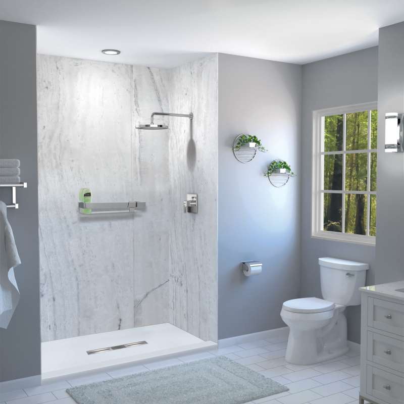 Upgrade your shower with Trimslate single threshold shower bases. Featuring a single add-on threshold that accommodates shower doors effortlessly. Threshold adjusts the maximum depth up to 2.5-in without any trimming of base. Crafted from solid sheet-molded compound material with sturdy structural ribs, it ensures durability and stability. Field trimmable for customization, it installs easily atop thinset mortar. The lightly textured slate floor is slip-resistant and easy to clean.