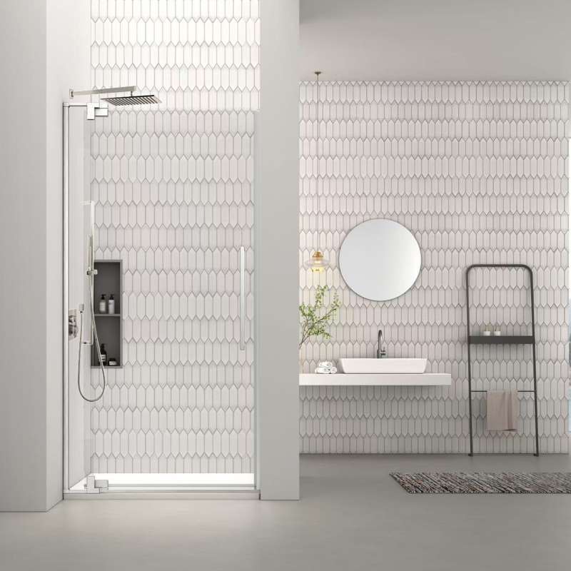 • 33-in to 36.5-in W x 76-in H hinged pivot shower door with fixed panel for an alcove shower