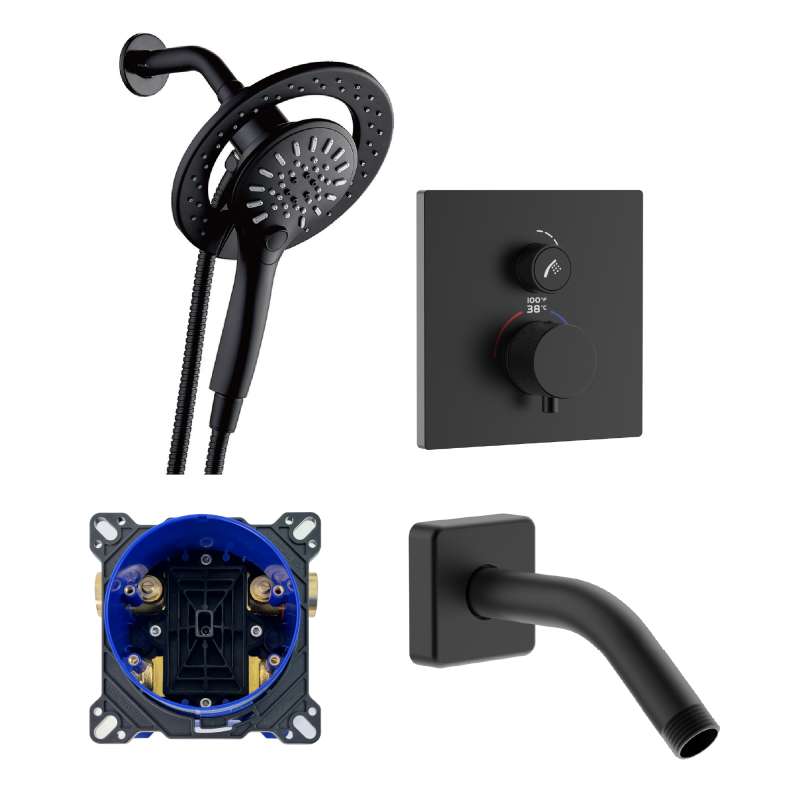 Kit includes: (1) 4.3125-in diameter magnetic docking hand shower, (1) 9-in shower arm, (1) single function thermostatic valve and trim, and (1) Forever Box